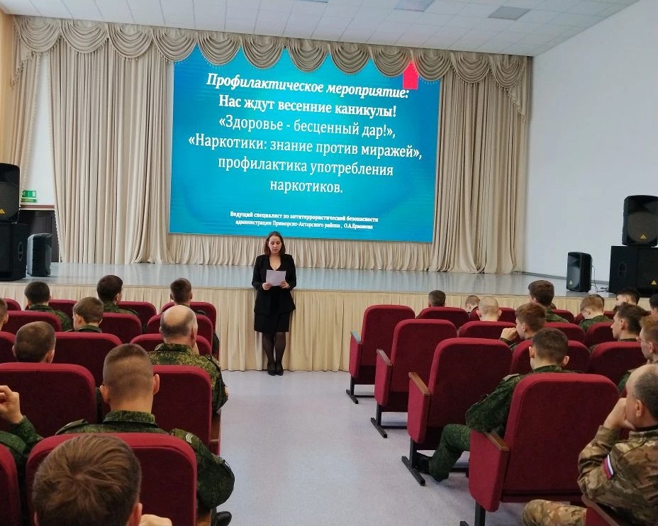 В актовом зале Бриньковского казачьего кадетского корпуса имени сотника М.Я. Чайки Краснодарского края состоялось профилактическое мероприятие «Наркотики: знание против миражей», которое провела ведущий специалист по антитеррористической безопасности администрации Приморско-Ахтарского района О.А. Ермакова.