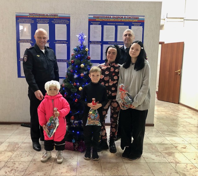 Многодетная семья с радостью пообщались с начальником районной полиции. Дети рассказали, что дома уже установили елку и с нетерпением ждут нового года. Начальник ОМВД порекомендовал быть бдительными, соблюдать меры личной и имущественной безопасности, с осторожностью относится к звонкам незнакомых людей, чтобы не стать жертвой телефонных мошенников, а также о запрете использования пиротехнических изделий несовершеннолетними. В завершении мероприятия все вместе сфотографировались у новогодней елки.
